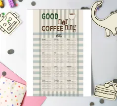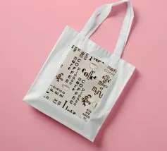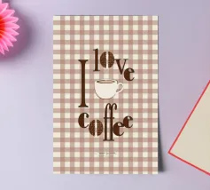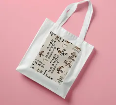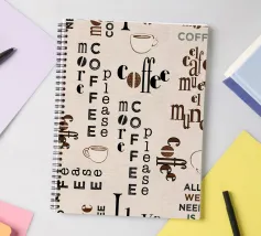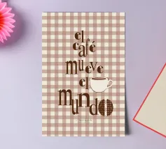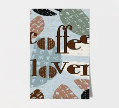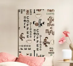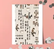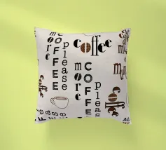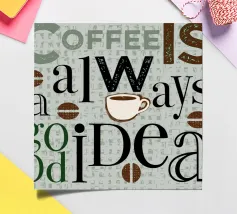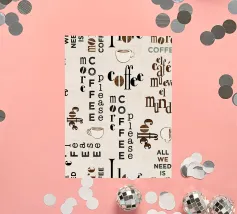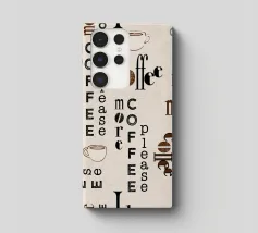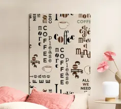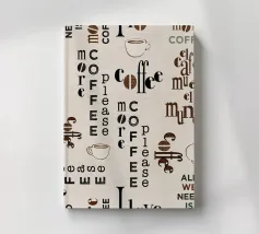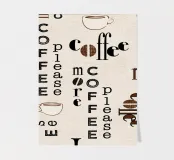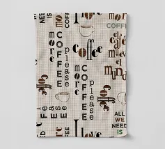 Different coffee quotes art pattern in brown tones on a linen textured cream background.