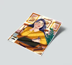 A red haired girl draws amid colorful supplies, blooming with imagination and creativity.