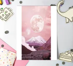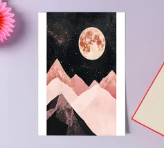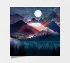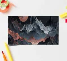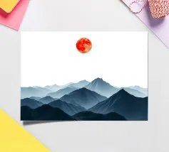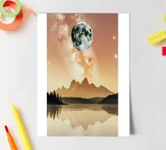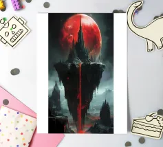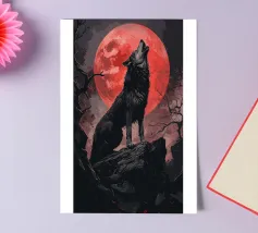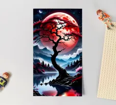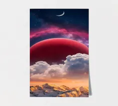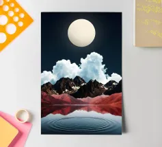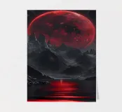 A breathtaking scene of a crimson moon casting its eerie glow over a desolate, mountainous landscape. The reflection of the celestial body in the still waters creates a mesmerizing contrast between light and shadow. This artwork evokes a sense of mystery and awe, inviting the viewer to contemplate the vastness and beauty of the universe.