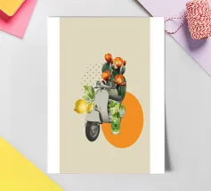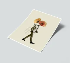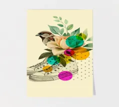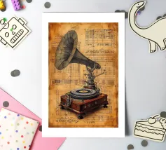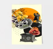 A nostalgic collage art print blending vintage charm with romantic whimsy. An ornate gramophone bursts with vibrant flowers and vinyl records, while a dancing couple captures the magic of timeless music. Perfect wall art for music lovers, retro decor fans, or anyone drawn to sentimental storytelling through design.