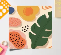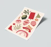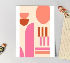 An abstract composition of deconstructed shapes, including leaves, arches, and geometric forms, arranged in a balanced and earthy color palette of terracotta, pink, and green.