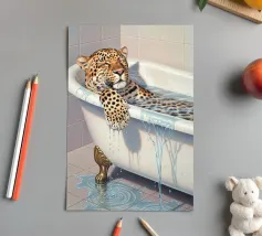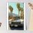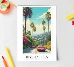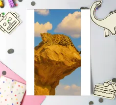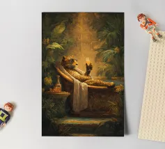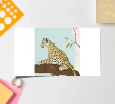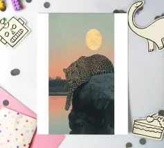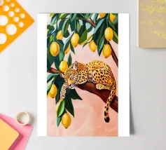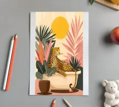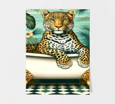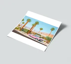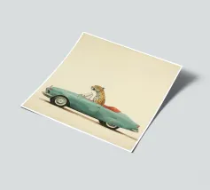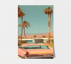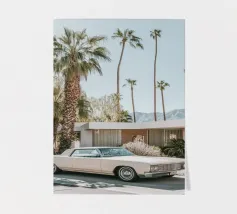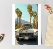 A sun-soaked desert scene featuring a relaxed leopard lounging on the hood of a vintage white Cadillac, surrounded by tall palm trees and rugged mountain views. This surreal blend of wildlife and retro Americana creates a striking visual that’s both bold and laid-back. Perfect for fans of luxury, road trips, desert vibes, and wild elegance.