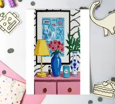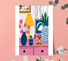 A quirky desk with pink lamp, vase flowers, matryoshka, and tea brings playful personality.