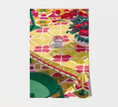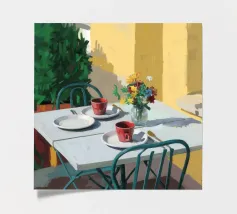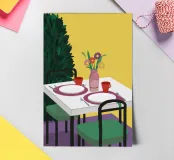 A simple, modern interior scene of a table set for two, with a vase of flowers as a centerpiece. The yellow wall and minimalist setting create an atmosphere of quiet intimacy and chic simplicity.
