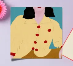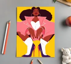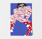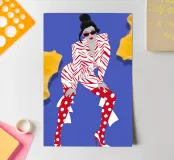 A high fashion illustration of a figure in a confident, dynamic pose, showcasing a bold clash of patterns with a geometric jacket and red polka dot pants, exuding pure energy.