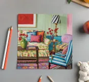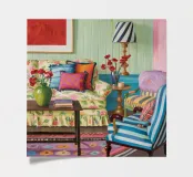 A vibrant, eclectic parlor filled with a mix of patterns and colors. A floral sofa, a striped armchair, and patterned wallpaper create a maximalist's dream, full of personality and creative energy.