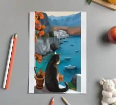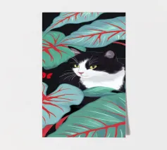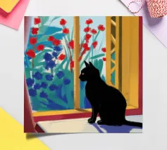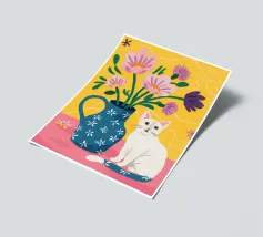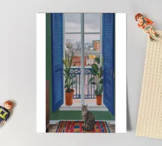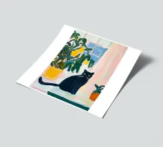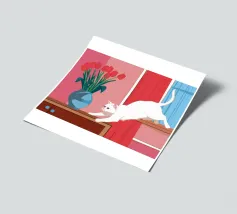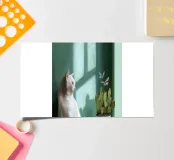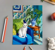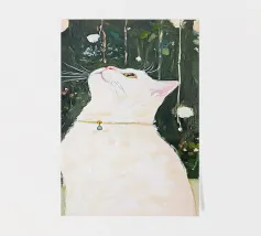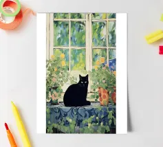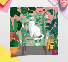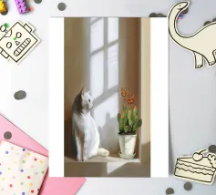 A peaceful white cat sits on a sunlit windowsill, watching butterflies flutter above a cactus in bloom. Soft shadows and green tones create a tranquil, dreamlike mood—perfect for adding calm and warmth to any space.