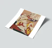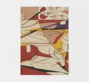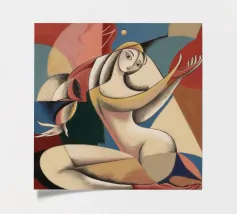 This painting showcases abstract figures in vibrant colors, including red, yellow, and purple. The composition is lively and full of energy.