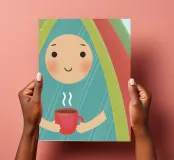 A calming illustration depicting a person with a gentle smile holding a warm cup of coffee.