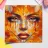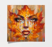 Portrait painting in a striking artistic composition where a woman's face is seamlessly blended with vibrant autumn leaves. The leaves, primarily in hues of orange, yellow, and red, form the contours of her face, creating a mask-like effect.