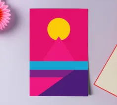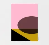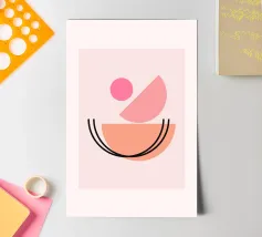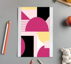Embrace the aesthetic of modern design with this striking geometric abstract art print. Featuring a captivating composition with color blocks in pink, yellow/orange, and black, separated by bold diagonal lines. A large dark red/brown oval shape is layered over these sections. This artwork uses simple geometric forms and strong color contrasts to create a visually engaging abstract piece, exploring the interaction of shapes and hues. This high-quality digital art file boasts a stunning 7000x5000 pixel resolution at 300 dpi, ensuring exceptional detail and clarity for your poster print. A perfec