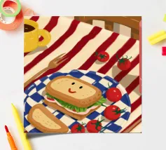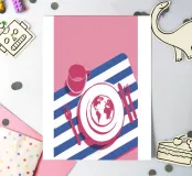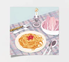 A minimalist and conceptual illustration of a single place setting on a striped tablecloth, with a globe on the plate. The artwork is a thought provoking statement on global cuisine or travel.