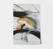 Thick black arcs and yellow accents twist through space like kinetic symbols.