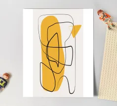 This abstract artwork feels like a spontaneous, improvisational sketch. Flowing black lines and scribbles interplay with a block of warm yellow and a textured beige background, creating a piece that explores movement, line, and form with a free, expressive energy.