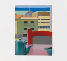 A wooden dining table stretches into a warmly lit interior filled with pottery and vibrant shadows, celebrating home�s quiet rhythm.