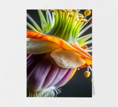 A stunning bearded iris in full bloom, captured in a close-up view against a dark background. The intricate details of the flower's ruffled petals, vibrant colors, and contrasting textures are beautifully highlighted. This exquisite artwork celebrates the beauty and elegance of nature's creations.