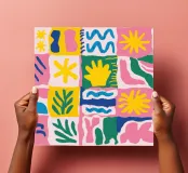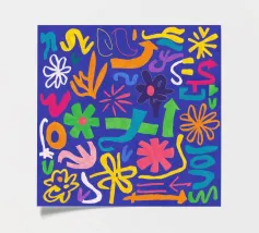 A joyful and colorful grid is filled with a variety of playful patterns and icons, including stylized flowers and abstract shapes, creating a cheerful and decorative design.