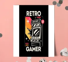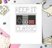 A retro gaming controller is depicted with the phrase "KEEP IT CLASSIC" in pixelated text. The design evokes nostalgia through its vintage aesthetic and simple color palette.