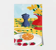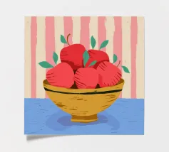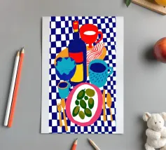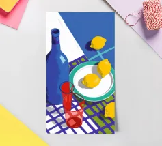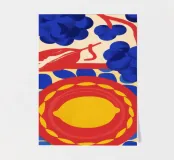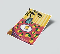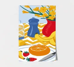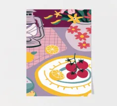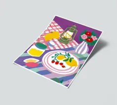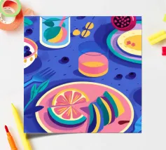 A bold, graphic pattern featuring a lemon sun motif, blue grapes or flowers, and red shapes. The style is modern and has a pop art feel.