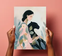This artwork captures a person in a black dress striking a poised pose beside a leopard. The scene exudes sophistication, confidence, and timeless artistry.