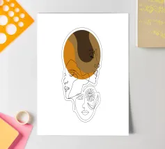 A continuous line drawing creates an abstract face with red lips and a star, overlapping with a sun shape on a textured background, blending minimalism and surrealism.