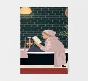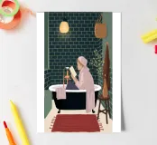 The painting portrays a person relaxing in a vintage-style bathtub, surrounded by a dark green tiled bathroom. They are reading a book, with a towel wrapped around their head. The warm lighting and elegant decor create a luxurious and tranquil atmosphere.
