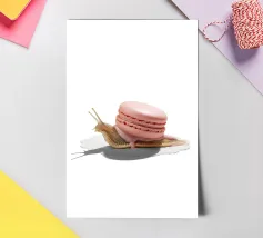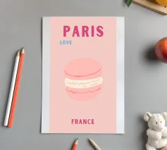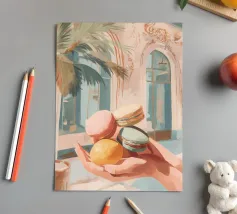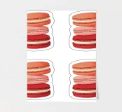 The image shows three stacked macarons in warm colours - orange, pink and red - with a creamy filling. The style is minimalist and aesthetically pleasing, with a focus on colour contrasts and texture. The composition looks modern and appetising, almost like something out of a high-end food magazine or an advertising campaign for French pastries.