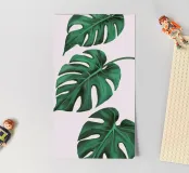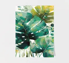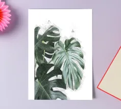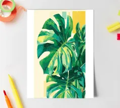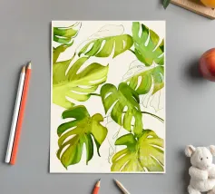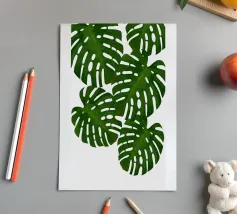 A close up illustration focusing on the iconic, fenestrated leaves of a monstera plant against a pale pink background. The composition is a simple, elegant, and minimalist study of a beloved natural form.