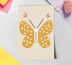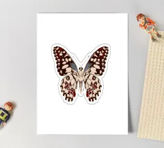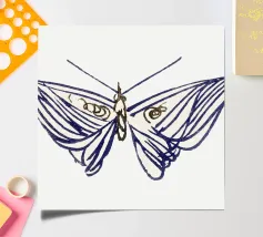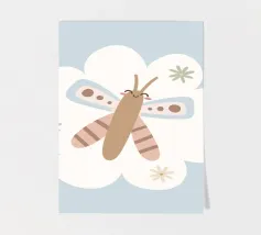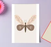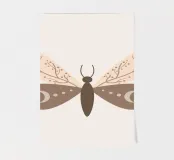 A stylized depiction of a moth features intricate designs on its wings, incorporating natural and celestial motifs. The wings display delicate outlines of branches and crescent moon shapes, set against a muted color palette.
