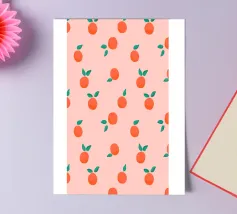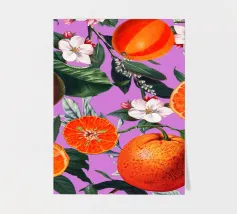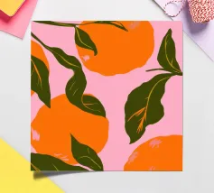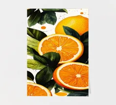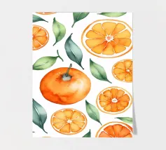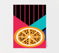 A vibrant, graphic pattern of repeating orange slices against a white and orange striped background. The composition is fresh, zesty, modern, and a cheerful celebration of citrus fruit.