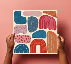 A gentle and pleasing pattern of abstract, organic shapes in pastel colors like pink, blue, and yellow, creating a soft, modern, and cheerful design.
