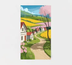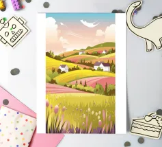 A rolling landscape of green and golden patchwork fields is seen from a high vantage point, with a lone tree and a distant farmhouse, celebrating the beauty of agriculture.