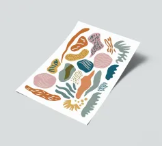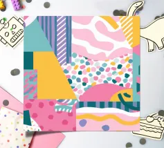 An abstract pattern combines patchwork-like color blocks with energetic scribbles and stripes, creating a dynamic, playful, and artistic design.