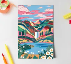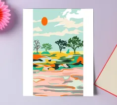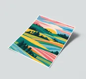 An expressive and vibrant landscape painting of rolling, patchworklike fields in shades of green, yellow, and pink. The painterly style captures the dynamic beauty and texture of the countryside.