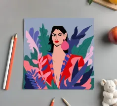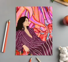 This artwork shows a person wearing a shirt with a geometric pattern, set against a background of green leaves. The focus is on the intricate design of the shirt and the natural elements surrounding it.