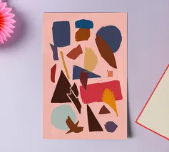 A modern and playful abstract composition featuring a gridlike arrangement of colorful, organic shapes. The artwork feels like a sophisticated and balanced puzzle of form and color.