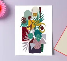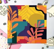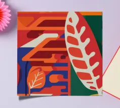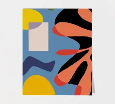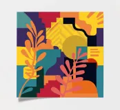 A bold abstract composition of stylized leaves and geometric shapes in primary colors of yellow, red, and blue, creating a vibrant and structured design.