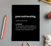 Add a dash of wit to your space with our hilarious "Procrastinating" typography art print. This clever design presents a humorous dictionary-style definition of procrastination, focusing on the universal tendency to snack when avoiding tasks. The crisp white serif lettering pops against a sleek black background, creating a sophisticated yet playful aesthetic. Perfect for offices, dorm rooms, or any area where you need a reminder to stay on task (or justify your snack breaks), this versatile artwork brings a smile to procrastinators and go-getters alike. Ideal gift for students, professionals