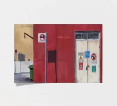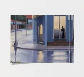 Viewed from a car, a lone figure is silhouetted in a doorway across a rain slicked street. The scene, with its wet reflections and moody lighting, evokes a sense of melancholy, mystery, and urban solitude.