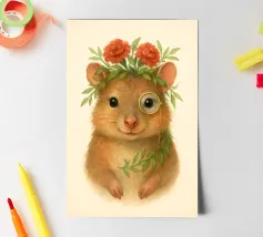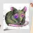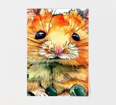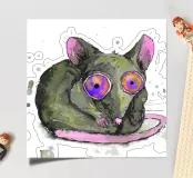 A spotty watercolor drawing of a black rat. Grunge dripping style. He has big purple eyes. He looks at you in bewilderment.