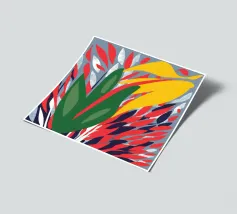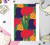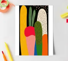 A vibrant and eclectic pattern featuring stylized red creatures, possibly foxes or cats, interspersed with colorful vases and plants. The composition is a playful and imaginative tapestry of recurring motifs.