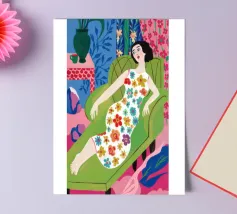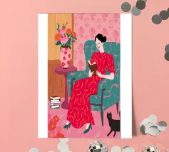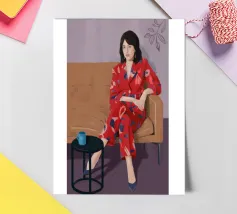 A woman in a red bird print robe sits in a patterned room holding coffee with a quiet yet graphic presence.