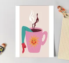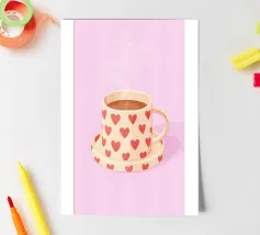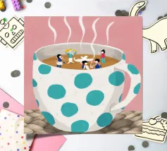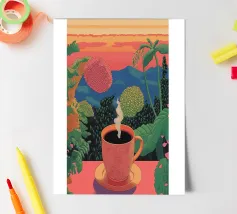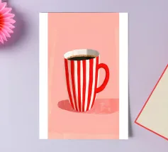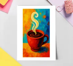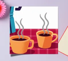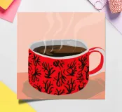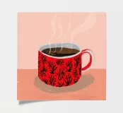 A close up illustration of a steaming hot cup of coffee or tea in a vibrant red mug with a detailed, intricate pattern. The cozy and detailed artwork is a warm invitation to take a break.