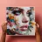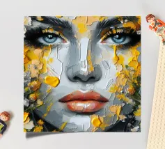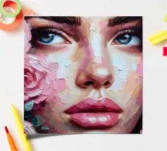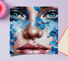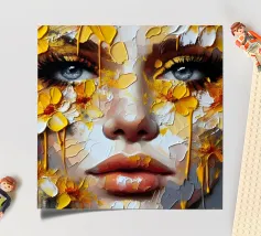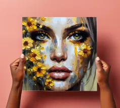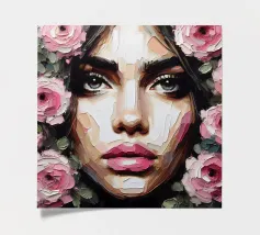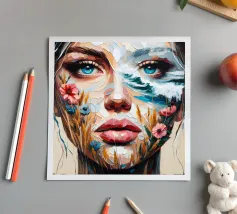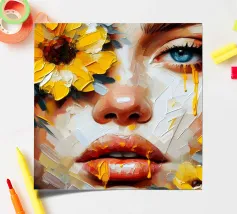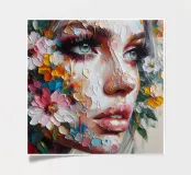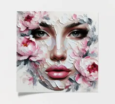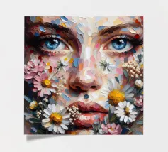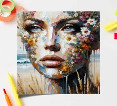 Portrait painting of female with colourful flowers and petals on her face.