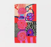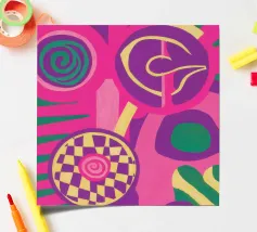A dynamic abstract composition features bold, rhythmic shapes, spirals, and patterns in a vibrant palette of reds, pinks, blues, and black, creating an energetic and visually stimulating piece.