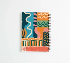 A vertical abstract composition with a cascade of colorful, rhythmic shapes and patterns, including waves, grids, and organic forms, in a palette of orange, blue, and teal.
