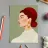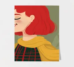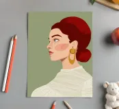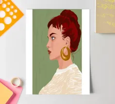 This highly elegant profile portrait showcases a woman with rich, ruby red hair meticulously styled into a bun. Her thoughtful, serene gaze, coupled with a simple gold earring against a soft green background, creates a timeless aura of classic beauty and sophistication.