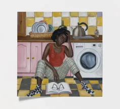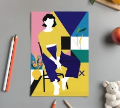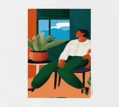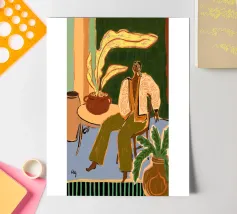 This artwork shows a person sitting on a striped chair, surrounded by sunflowers and a green bag. The background is a muted brown, creating a rustic and reflective atmosphere.
