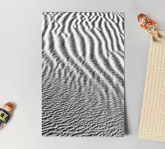 Curving lines, ridges, and swirling textures form natural designs, like nature’s artwork etched into the earth. Each grain catches the light, creating soft shadows and golden highlights that shift with the sun. The patterns are ever-changing, quietly recording the rhythm of nature’s touch.”