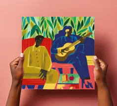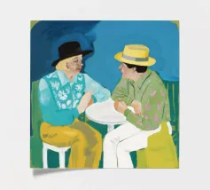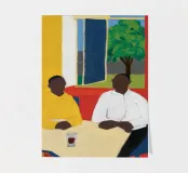 An intimate interior scene portraying two people, one dark-skinned and one light-skinned, seated at a vibrant yellow table, possibly sharing a meal or conversation. Green foliage is visible through a window behind them, adding to the warm and cozy atmosphere.